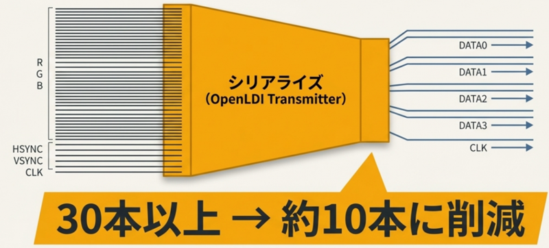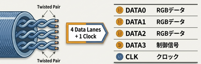 シリアライ図(直列化)により、数十本あった画像データと制御信号が、わずか5つの差動ペア(約10本の物理戦)にまとめられます。