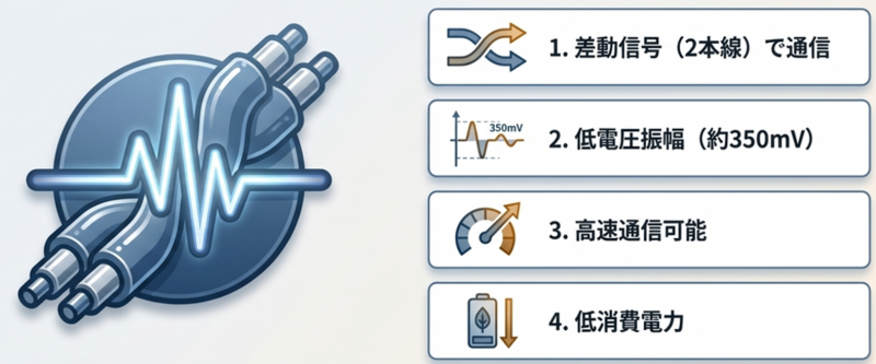 LVDSは「どうやって電気信号を送るか」を定めた物理層の規格