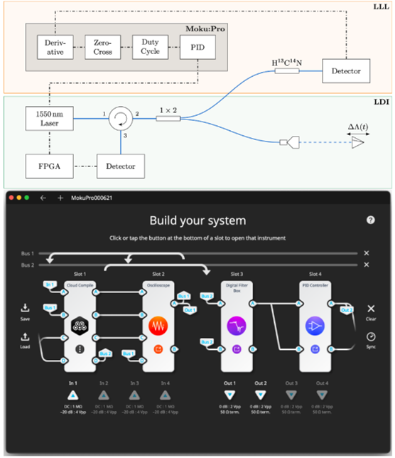 研究チームは、Mokuのフェーズメーター機能を活用しました。レーザー光源からの参照信号とファイバーを通過した信号の位相差を、デジタル・フェーズ・ロック・ループ(DPLL)を用いて直接計測します。これにより、外部の複雑な復調用ハードウェアを介さず、1台のMokuの中で光信号の微小な位相変動をマイクロラジアン精度でリアルタイムに抽出しました。