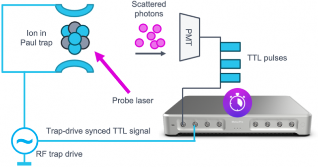 研究チームは、FRA(周波数ドメイン)ではなく、タイムドメインでのパルス計数統計に基づき、この複雑な課題に挑みました。トラップ系から出力される「RFトラップ駆動信号(TTL同期信号)」をMoku:Proのアナログ入力に、イオンからの蛍光フォトン(Scattered photons)を捉えた「PMT(光電子増倍管)のTTLパルス」を別のアナログ入力へ接続します。Moku:Proに搭載されたタイムスタンプ機能により、PMTパルスの到着時刻を、RF駆動信号を基準とした相対時間として極めて正確に記録。RF電場の周期に同期したフォトンパルスの到着時間分布(タイムヒストグラム)を統計的に解析することで、マイクロモーションによる周期的な振動(=ヒストグラム上の山)を、他のノイズ成分から明確に分離して評価する手法を確立しました。