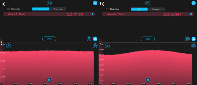 Moku:Proの直感的なUI(Mokuソフトウェア)では、タイム&周波数アナライザ機能によって、取得されたタイムヒストグラムをリアルタイムで監視・解析できます。エンジニアは、イオンの位置を最適化するDC補償電圧を変化させた際、ヒストグラムの形状変化をボート線図ではなく、時間軸の山(ピーク)の変化として瞬時に捉えることができます。調整によって、ヒストグラム上のRF周期に同期した山を潰し、平坦(フラット)にするポイントを探し出すことで、イオンがトラップ電場の中心に位置する「ヌル点」を視覚的に、かつ数分で特定します。従来のように専用の高速パルス計数ボードや複雑なキャリブレーションが必要だったセットアップが、Moku:Pro 1台のソフトウェア機能で簡素化されました。