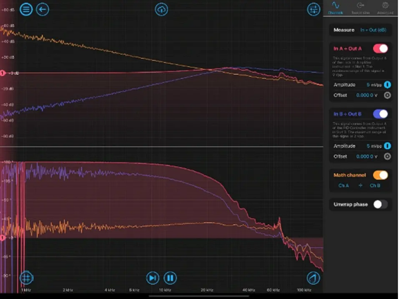 位相計測に加え、Mokuの周波数応答アナライザを併用することで、ファイバー系の伝達関数を素早く取得。変調周波数をスイープさせながら、ファイバーの動的な応答特性をボート線図としてリアルタイムに描き出します。iPadやPCの直感的なUIにより、フィルタ設定やゲイン調整をその場で行いながら、最適な計測条件を迅速に導き出しました。