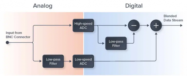 Moku:Proはこの課題を解決するために、異なる特性を持つ複数のADCを組み合わせる「ブレンデッドADC」アーキテクチャを採用しています。FPGA内で、高周波成分に最適化された高速ADCパスと、低周波領域のノイズを極限まで抑えた高精度パスをデジタル合成(ブレンド)します。これにより、全帯域においてシームレスかつ最適なSN比を維持した信号処理を可能にしました。