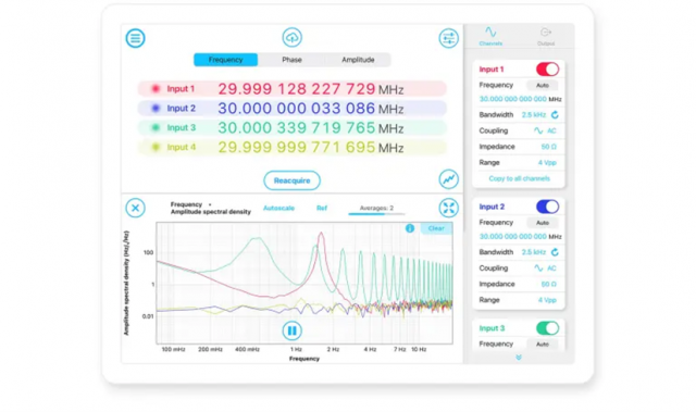 Moku:Proの直感的なUIは、最大4チャンネルの位相・周波数・振幅の推移を、iPadやPC上で同時に、かつ時間軸を完全に同期させて表示します。エンジニアは、複雑なコマンド入力なしに画面上のタップ操作だけで、トラッキング帯域幅の最適化や位相アンラップの設定を瞬時に行えます。さらに、内部SSDへの高速ロギング機能により、数時間にわたる長期安定性試験のデータも、取りこぼしなくシームレスに記録可能です。
