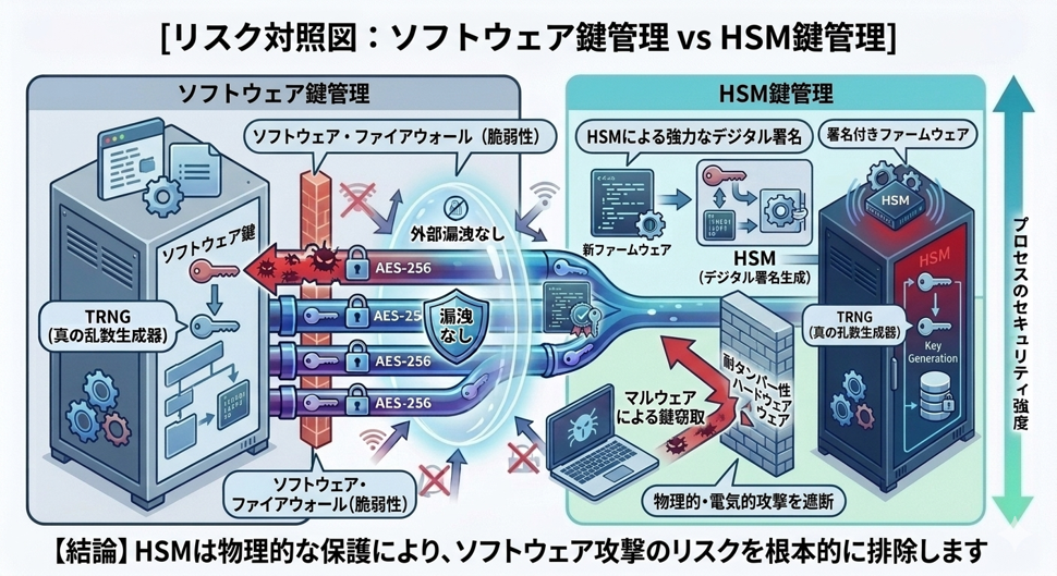 - 問題点(ソフトウェア環境の限界): ソフトウェアベースの環境で鍵管理を行った場合、権限のないアクセスやマルウェアによって秘密鍵が容易に窃取されるリスクが高まります 。鍵が漏洩すれば、デジタル署名の偽造による不正なアップデートが可能になり、デバイスのアイデンティティそのものがハッキングされる「なりすまし」の危険が生じます