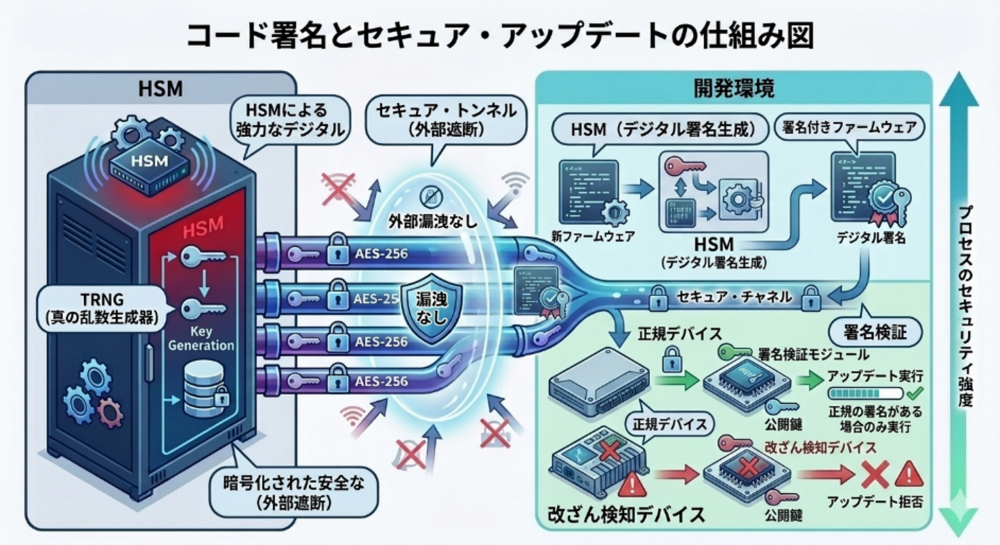 - 改ざん防止の要: コード署名にHSMを利用することで、ファームウェアの更新が正規の製造者によるものであり、かつ改ざんされていないことを保証します。これにより、ハッカーによる不正コードのインストールを防ぎます 。