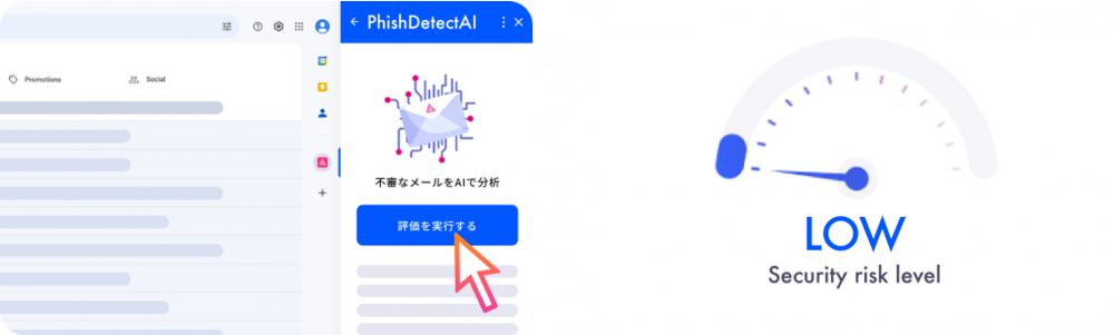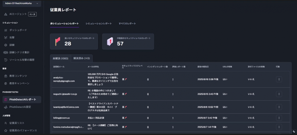 従業員が受信した不審なメールをワンクリックでAIに報告・スキャンさせ、リアルタイムでリスクレベルを判定します。