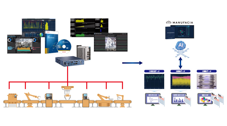 設備の稼働状態と挙動を制御機器と各種センサーから収集し一元的に設備の状態を『見える化』します。AIモデル生成ツールManufaciaを用いてノ―コードで検知モデルを生成。設備状態監視の『見える化』と『エッジAIモデルによる異常検知』は生産ラインの安定稼働、歩留まり改善、効率的な生産計画の実行、品質改善にも貢献します。