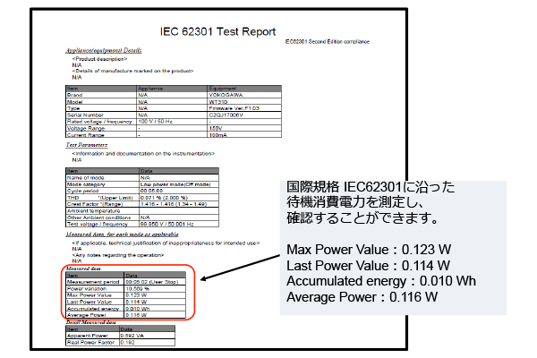 ●WT310の消費電力ソフトウェアを使用すると、下記のようなテストレポートを作成できます。
