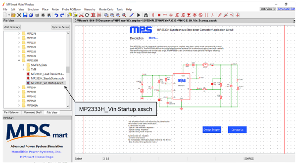 - File ViewのウィンドウからExamples 82→SIMPLIS→MPSの順にフォルダを開き、すでに準備されたMPS製品シミュレーション回路を開きます。