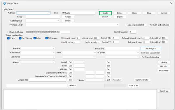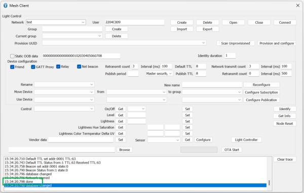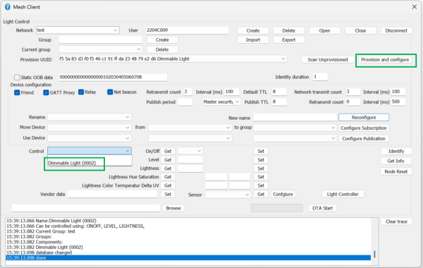 - Provision and configureボタンを押下すると、Traceログにdoneが表示され、Controlリストボックスにて、デバイス名が選択表示できるようになります。