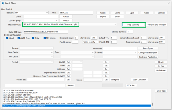 - Scan Unprovisionedボタンを押下すると、Provisioned UUIDのリストボックスに、デバイスが表示されます。デバイスが表示されたら、Stop Scanningボタンを押下します。
