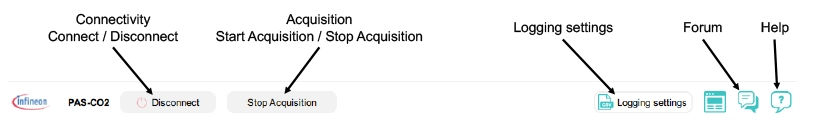 XENSIV™ PAS CO2 Sensor2Go GUI のメイン ツールバーは、提供する機能に応じて 4つのセクションで構成されています。