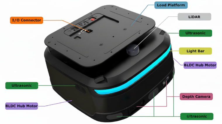 2. 目の役割を担う、同社の高精度ステレオカメラが搭載されています。3D深度認識技術により、周囲の障害物を高精度に検知し、複雑な環境下でもより高度な自律移動を可能にしています。