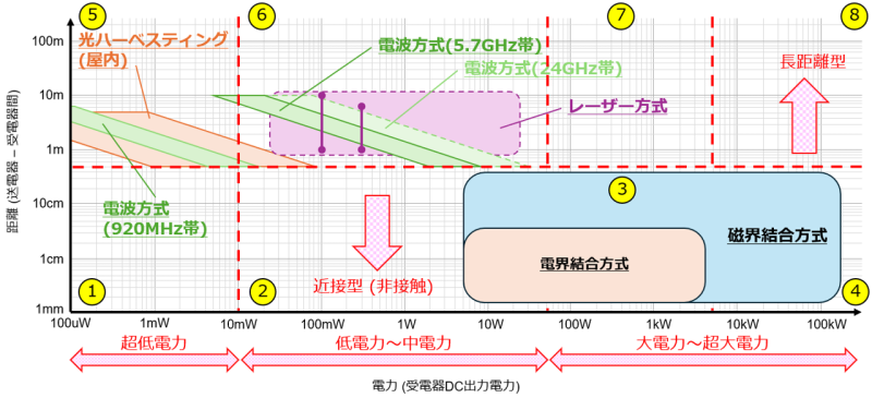 ここでは、主な種類と特徴をまとめてみます。横軸を受電器の負荷で使用可能な電力 (受電電力)、縦軸を送電器と受電器間の距離とします。