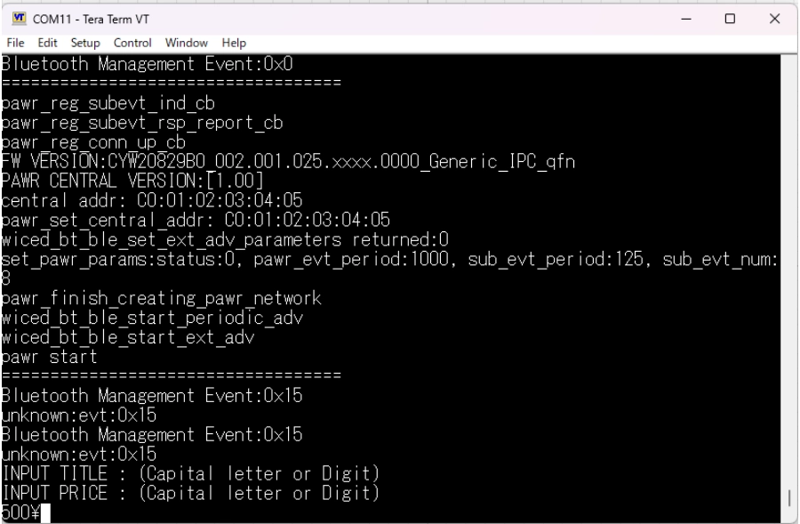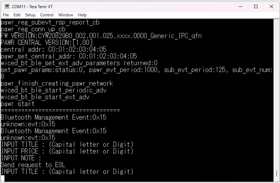 - 同期後、Tera TermでTITLE(商品名)、PRICE(価格)、NOTE(注記)を設定し、各Scannerへアドバタイズデータ送信します。