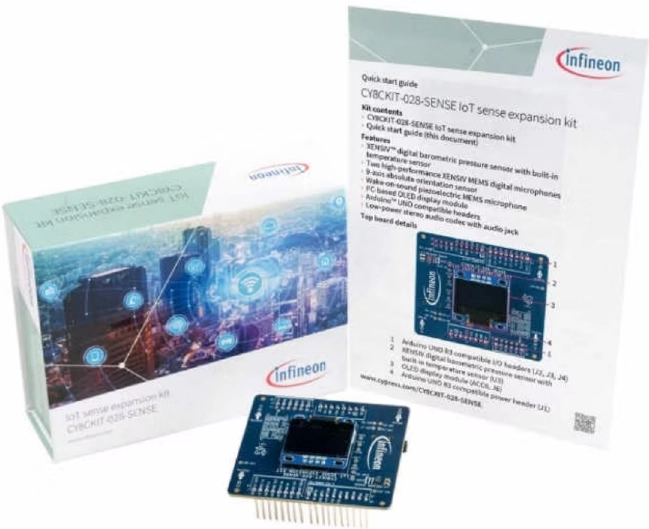 IoT Sense拡張キット(CY8CKIT-028-SENSE)は、オーディオおよび機械学習アプリケーションを対象としたArduino Unoベースのボードです。このキットはデジタル/アナログマイク、圧力センサー、モーションセンサー、ディスプレイが搭載されており、 CYW920829M2EVK-02 をはじめ、CY8CKIT-062S2-43012、CY8CEVAL-062S2などのInfineonマイクロコントローラ評価ボードと接続できます。 - メーカーWebサイト