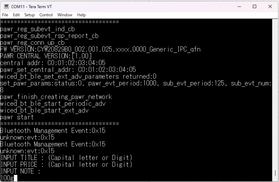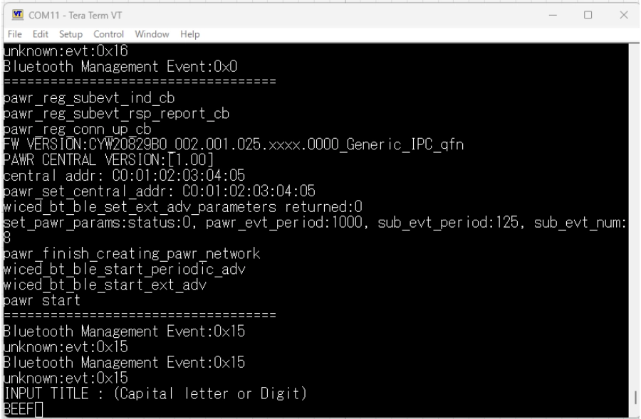 AdvertiserからScannerに送信するデータをTera Termで書き込みます。