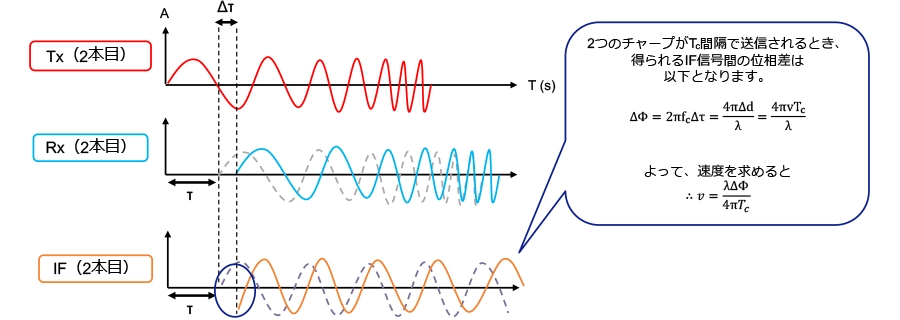 速度の算出は以下のようにTcの間隔で送信される2本のチャープを使用し、移動中の物標のある2点から取得できるIF信号の位相差から検出します。