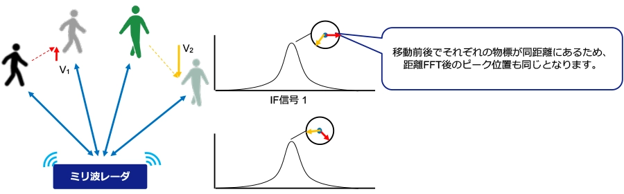 ここでは測定時に2つの物標が異なる速度で動き、移動前後の位置がそれぞれレーダーから見て同距離に存在するケースを考えます。この場合、2つのチャープから生成されるIF信号1, 2に距離FFT処理すると、同じ位置にピークが現れることになり、距離の観点では物標を個別に検知することはできません。しかし図7のように、距離FFT後のデータには位相情報がベクトルとして含まれています(このケースでは2つの物標の位相情報が合成ベクトルとして含まれています)。これを利用することでそれぞれの物標の速度を検知することができ、お互いに区別することができそうです。