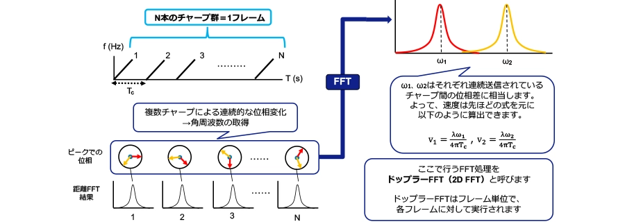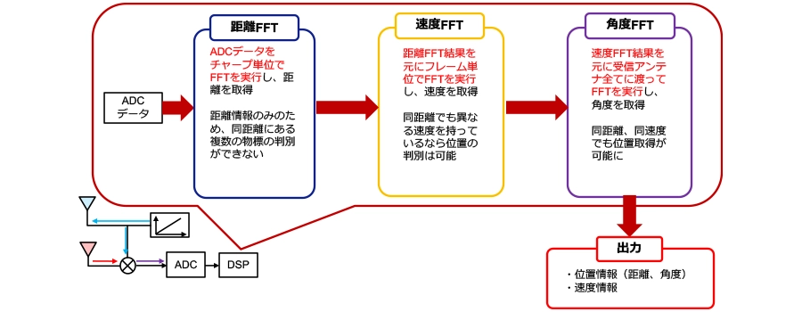 図1-⑤では、センシング後のデータをDSPで処理し物標の位置情報や速度を取得していると説明しました。ここからは、ミリ波レーダーがどのようにしてそれらの情報を取得しているのか詳しく見ていきましょう。
