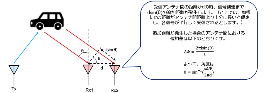 角度検出は複数の受信アンテナを用いて、各アンテナ間における位相差を検出することで実現します。