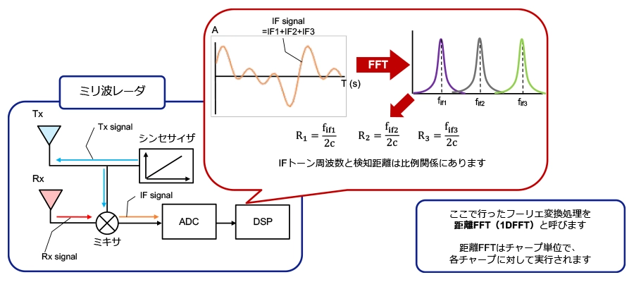 生成されたIF信号をAD変換後、後段のDSP処理でフーリエ変換 (FFT)を行う事により異なる周波数スペクトルを得ることができ、その結果から物標ごとの距離情報を計算することができます。