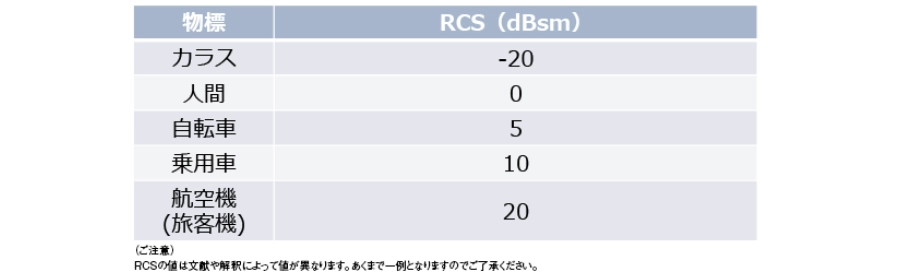 RCSは一義的に決まらない変動量であるため、平均的な値で検討されることが多く、具体的な目安としては表1のようになります。